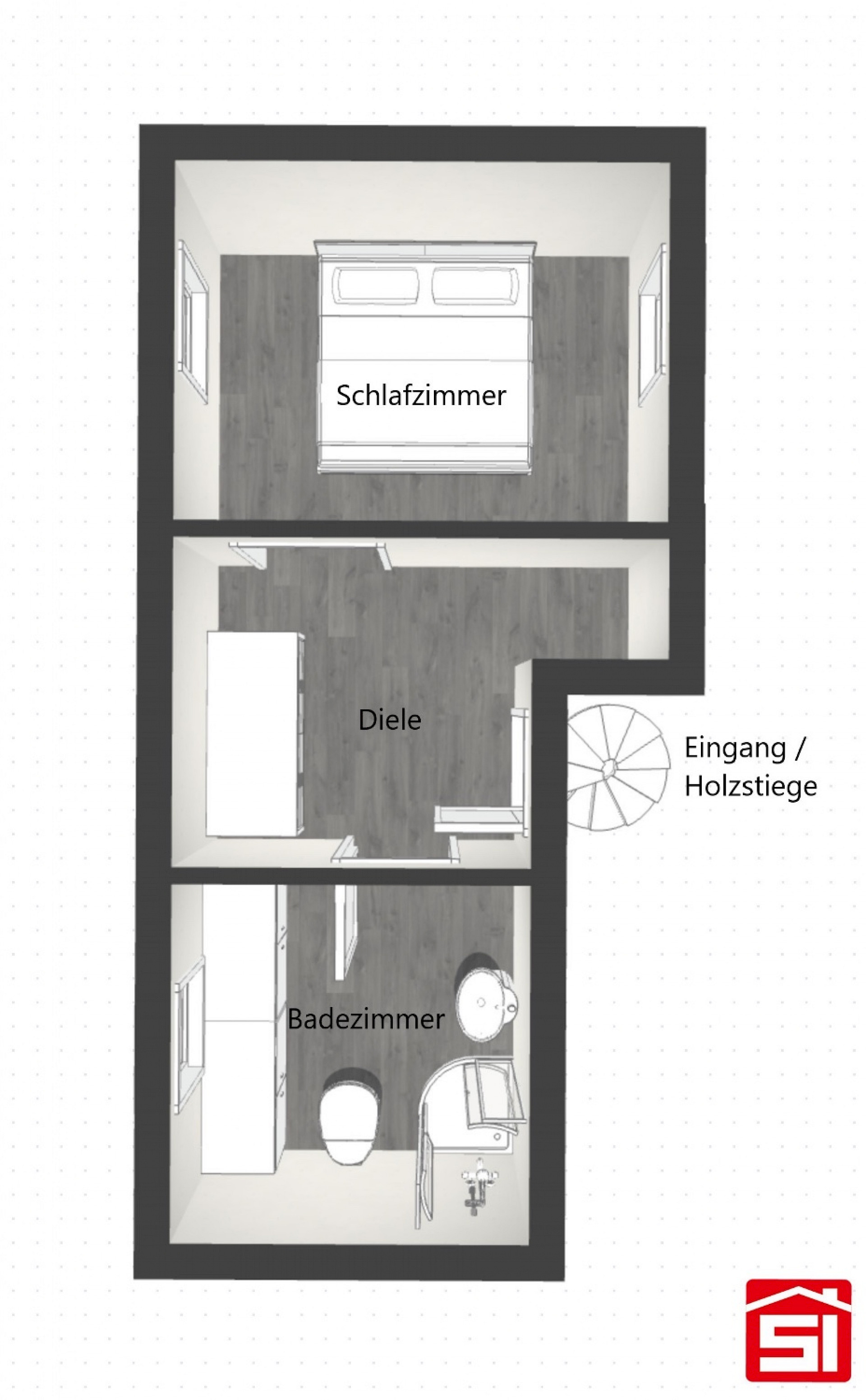 - Darüber hinaus erreicht man durch eine steile Holzstiege den weiteren Wohnbereich im Dachgeschoss: