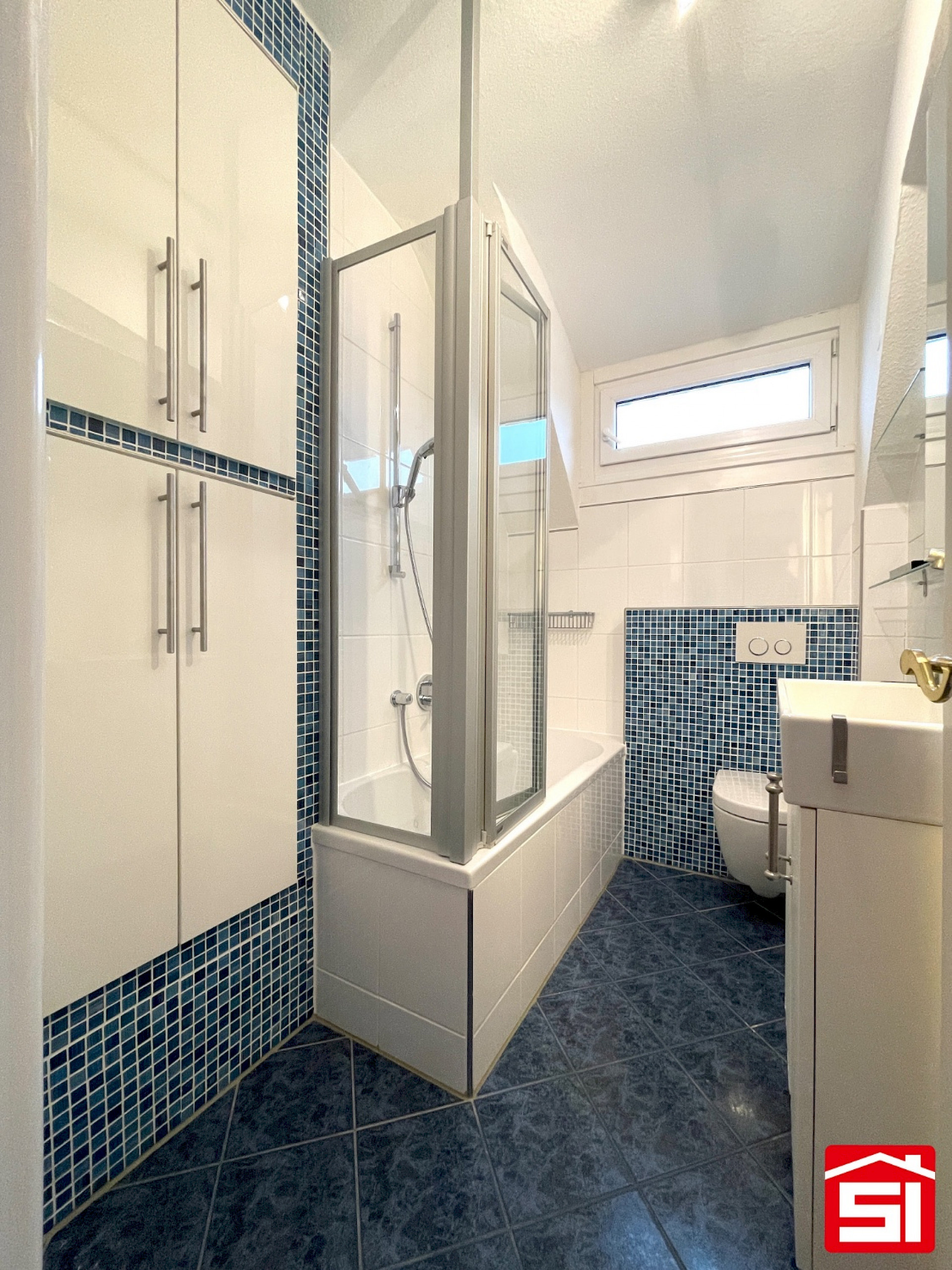 - weiteres Tageslichtbadezimmer mit Dusche, ausgestattet mit schönen Mosaikfliesen in Grautönen und praktischen Verstaumöglichkeiten