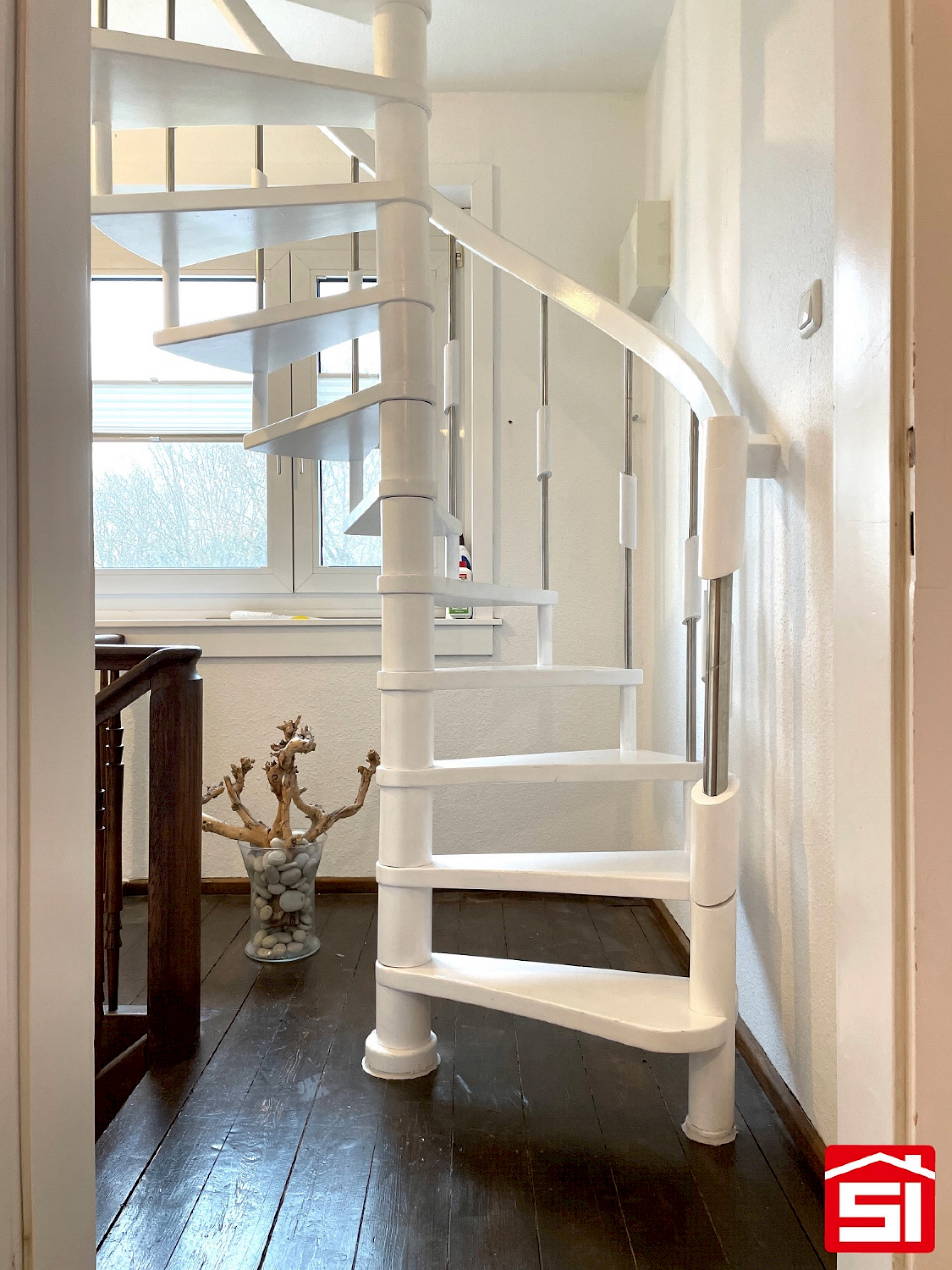 - Das Besondere an dieser Wohnung ist, dass sich der obere Bereich der Maisonettewohnung autark, z.B. von einem Jugendlichen mit Wunsch nach Privatsphäre bewohnen lässt, da der Zugang dazu - über die Holzstiege - im gemeinschaftlichen Treppenflur steht.