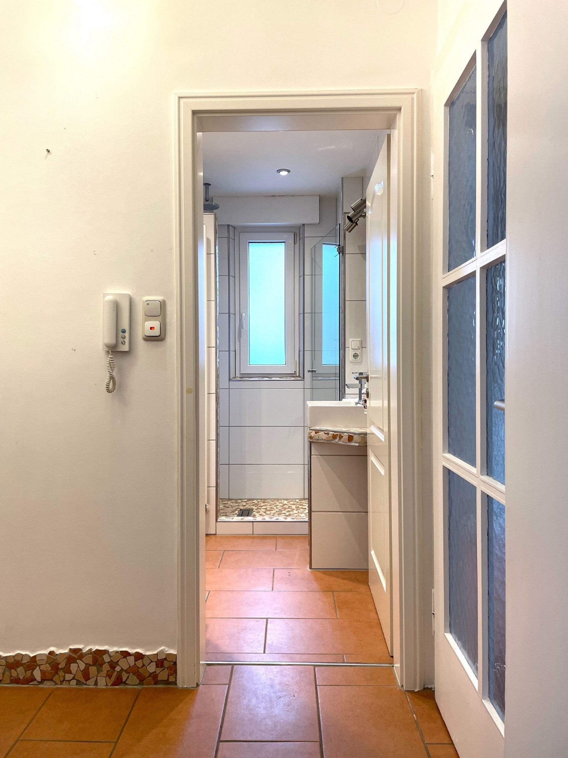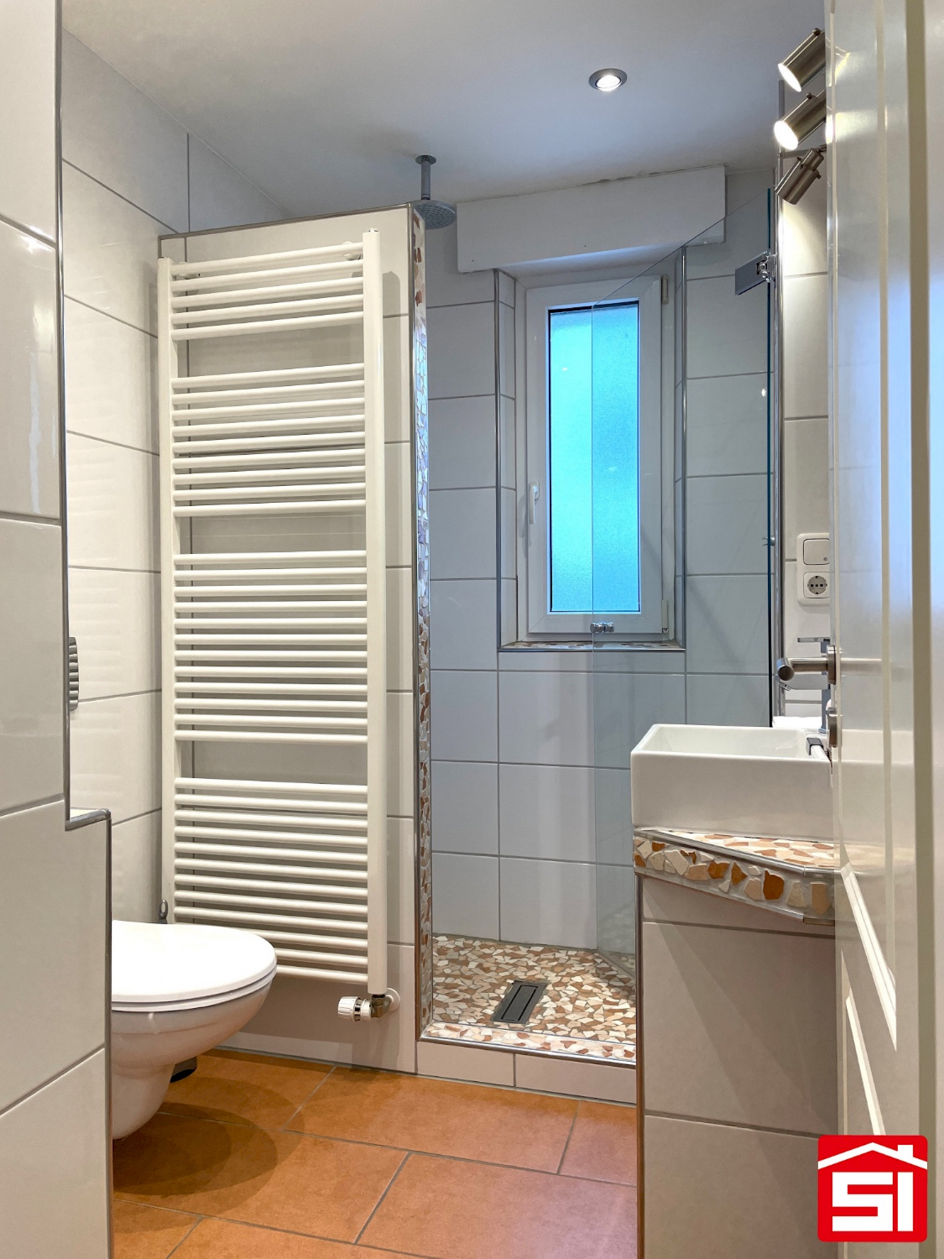 - besonders wertig gefliestes Tageslichtbadezimmer mit begehbarer Dusche (mit Sitzmöglichkeit) sowie vielen Abstell- und Verstaumöglichkeiten
