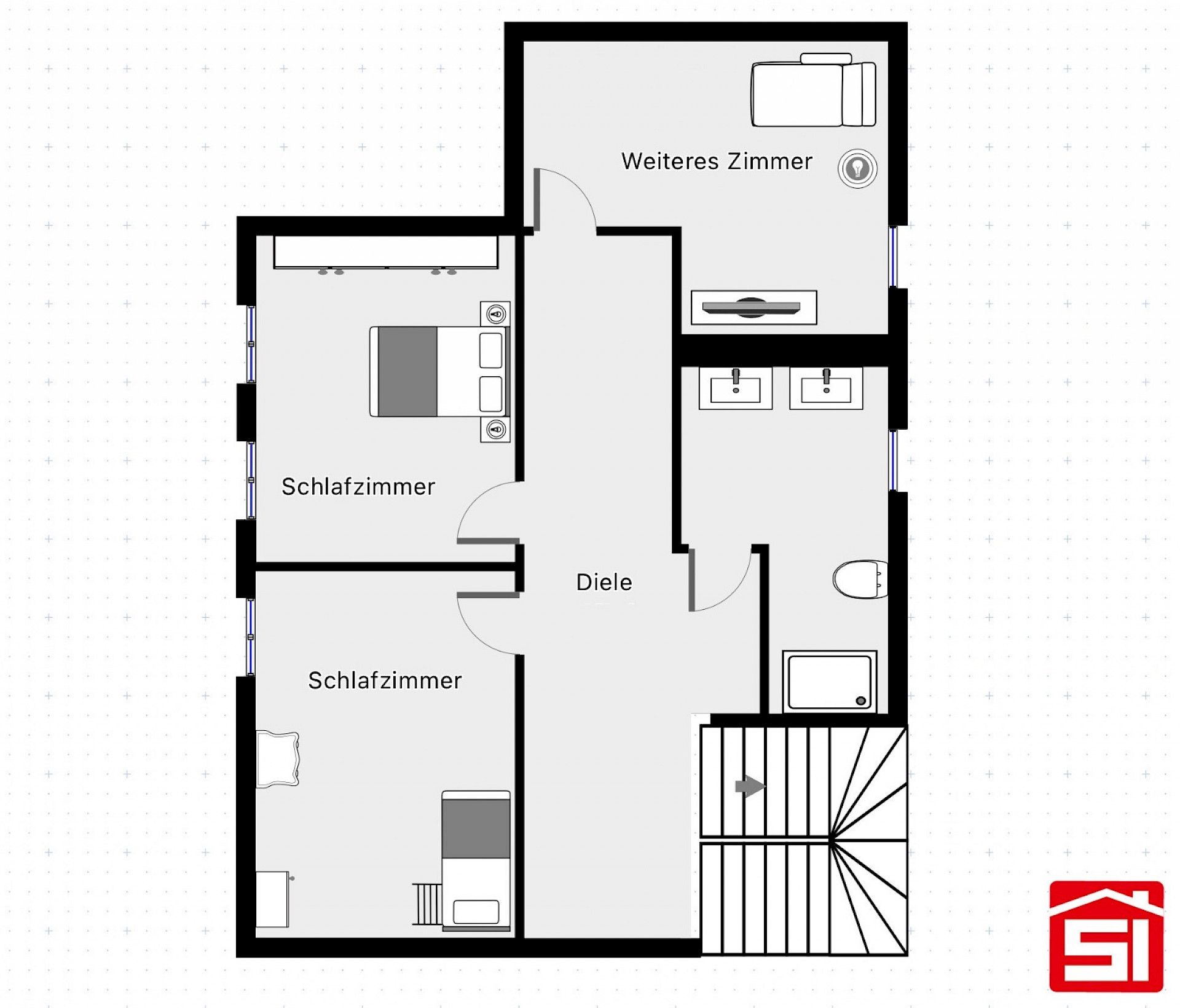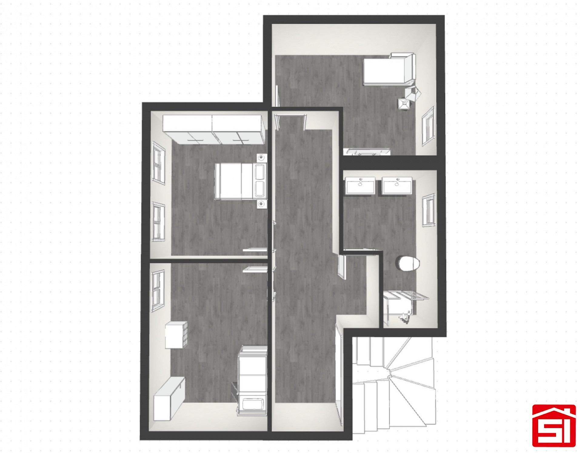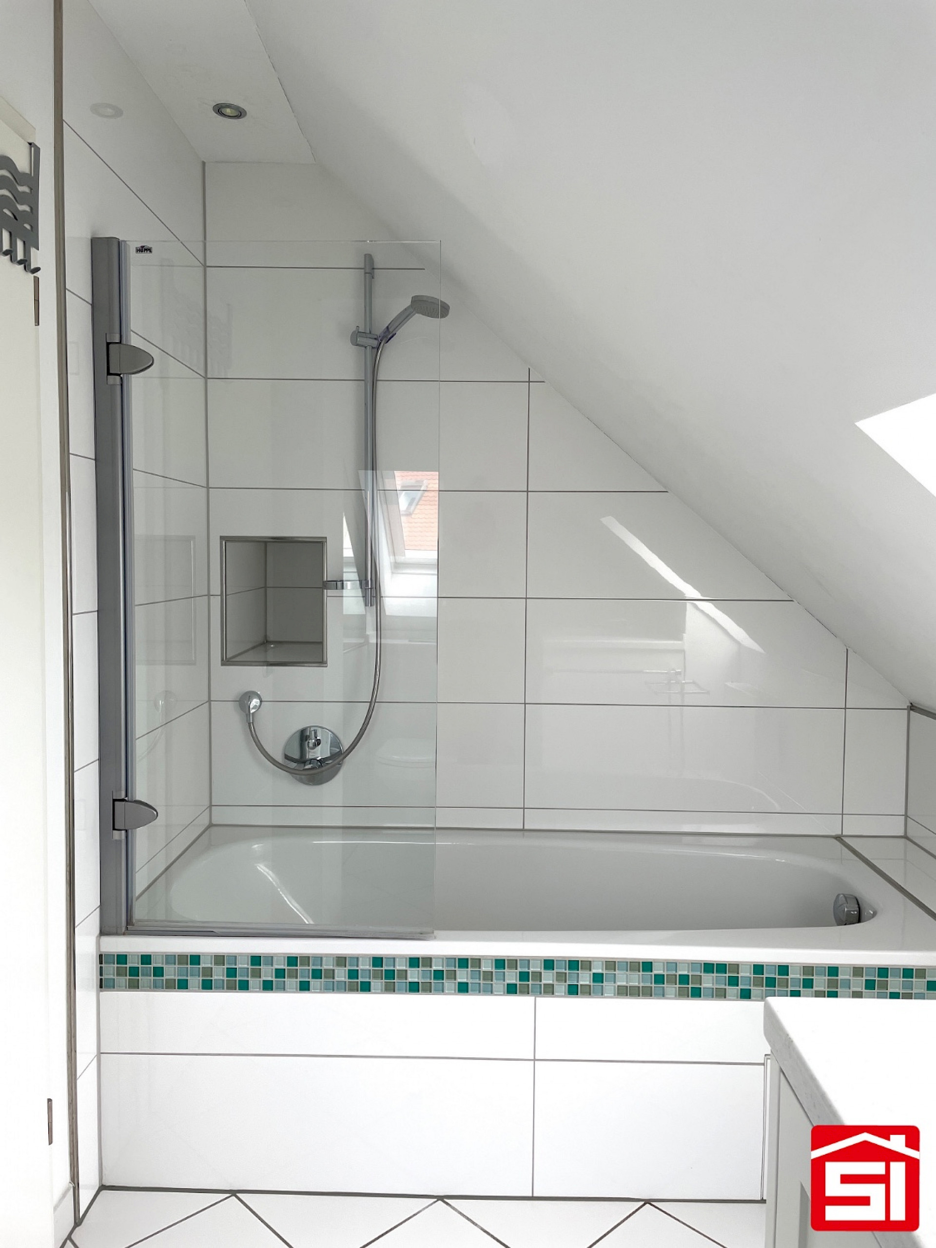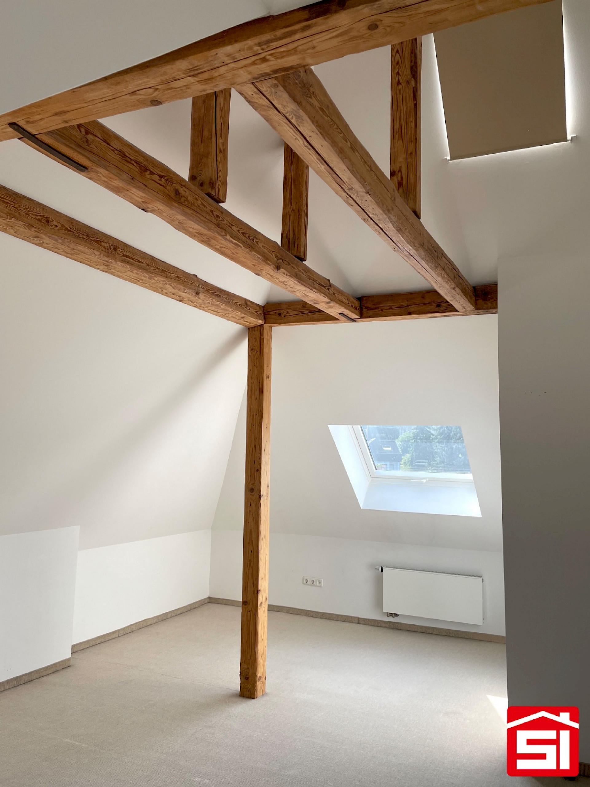 Im obersten Geschoss befinden sich zwei weitere Schlaf- oder Arbeitszimmer, in denen eine offene Holzbalkenkonstruktion ein besonderes Wohngefühl verbreitet. Ein weiteres Tageslichtbad mit einer einladenden Badewanne komplettieren die oberste Etage.