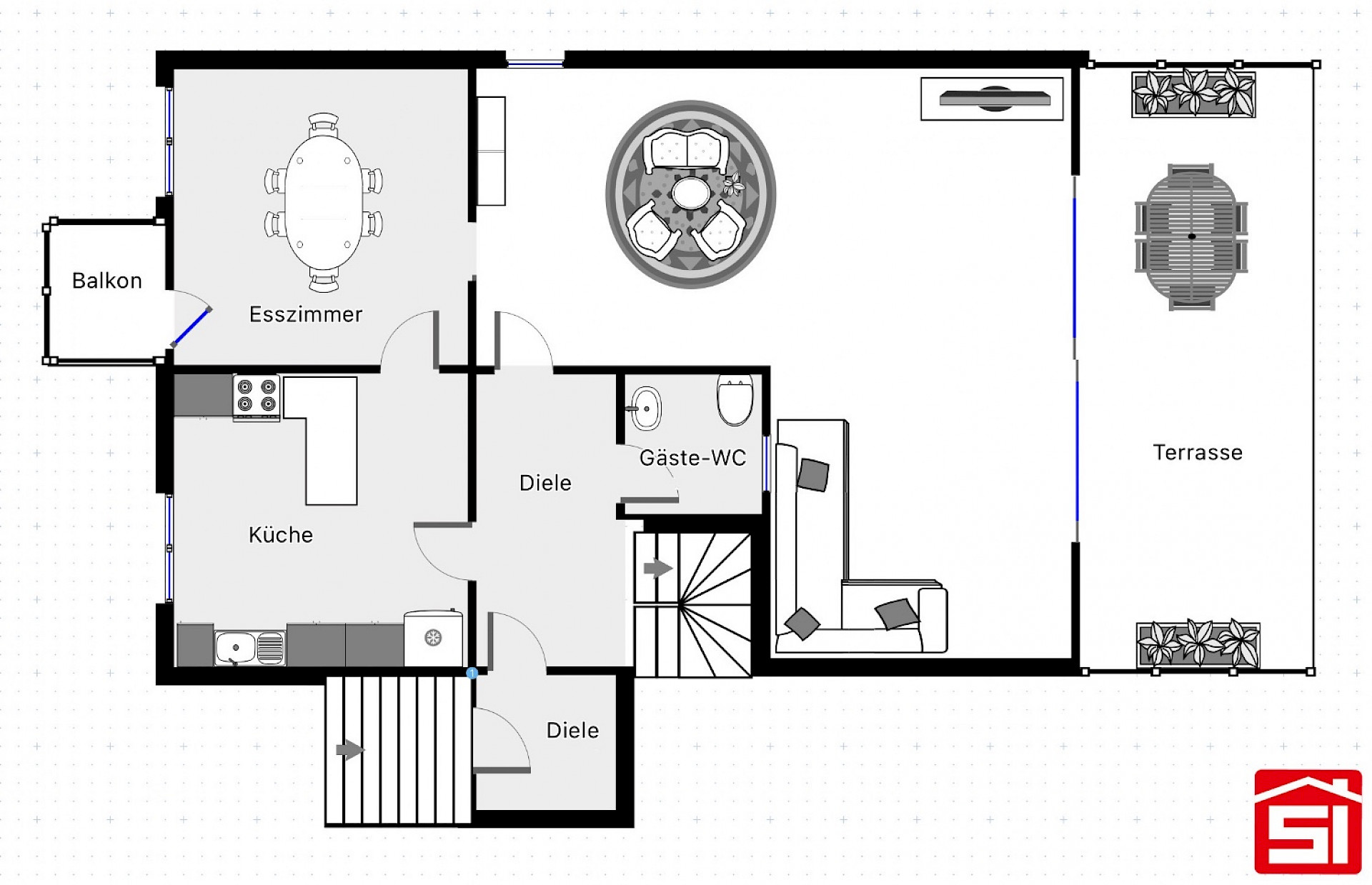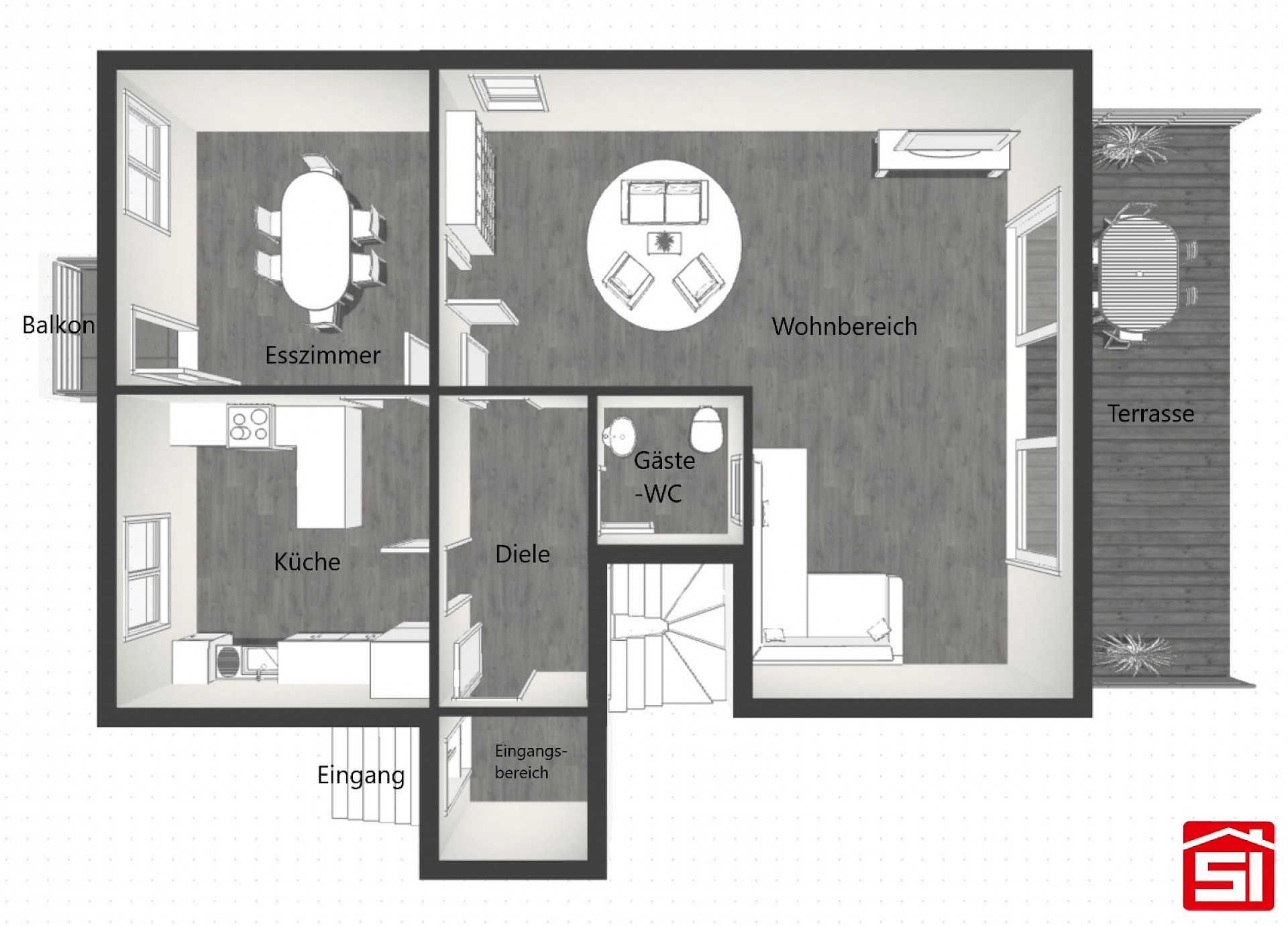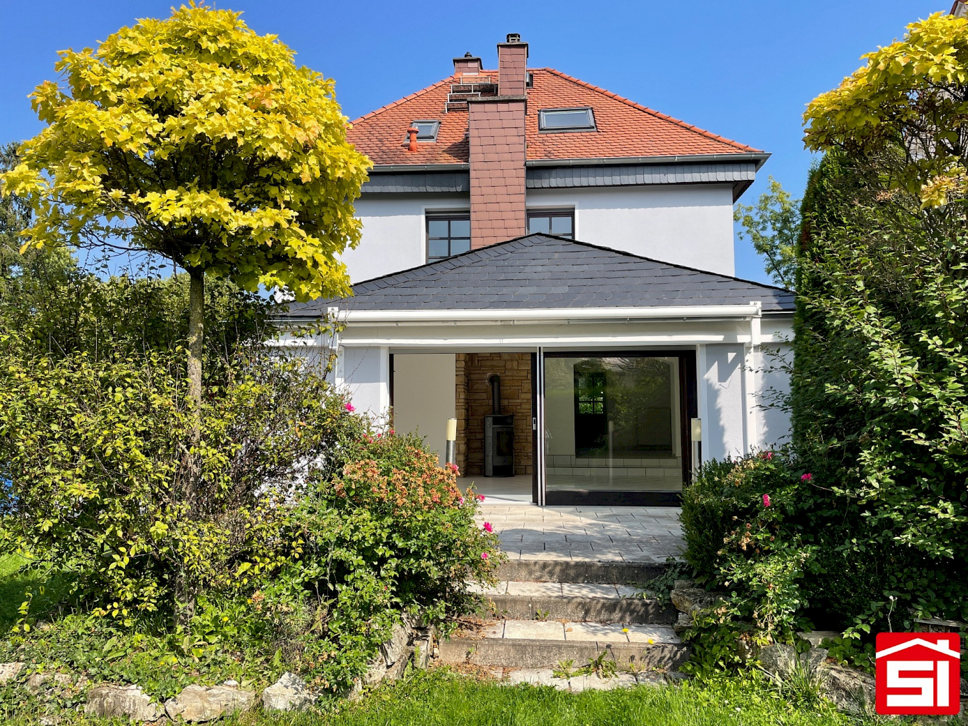 Im Erdgeschoss befindet sich der Küchenbereich samt hochwertiger, voll ausgestatteter Einbauküche mit unzähligen Verstaumöglichkeiten und hochwertigen E-Geräten. Der großzügige Wohn-/Essbereich im EG verteilt sich auf zwei, durch 2 Stunden getrennte Ebenen, wovon beide jeweils über einen gemütlichen Kamin verfügen. Auf der Rückseite des Hauses liegt die sonnenverwöhnte Terrasse, leicht erhöht über dem Garten. Von hier gelangt man über eine kleine Treppe in den wunderschönen Gartenbereich mit vielfältigem Baum- und Beetbestand. Idealerweise haben die zukünftigen Mieter Freude an der Gartenarbeit und pflegen und gestalten den Garten überwiegend selbst. Ansonsten könnte diese Arbeit jedoch auch einem Dienstleister übertragen werden. Neben der Küche gelegen befindet sich ein weiteres (Ess-)Zimmer mit vorgelagerten Balkon zur Vorderseite des Hauses. Ein Tageslicht-Gästebad rundet das Raumangebot im EG ab.